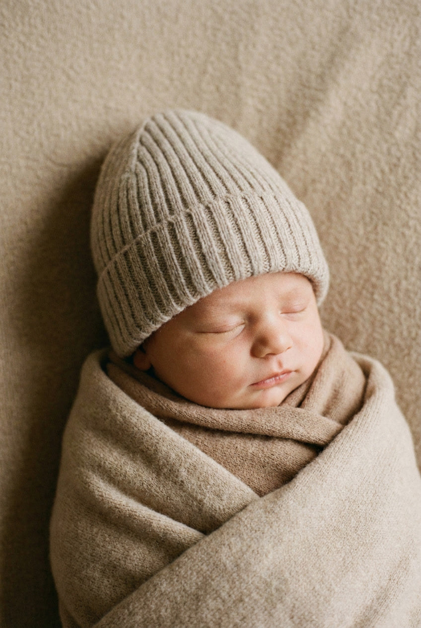 Babymütze aus ultrafeiner Merinowolle. Warme, grob gestrickte Mütze. Nachhaltig und fair hergestellt