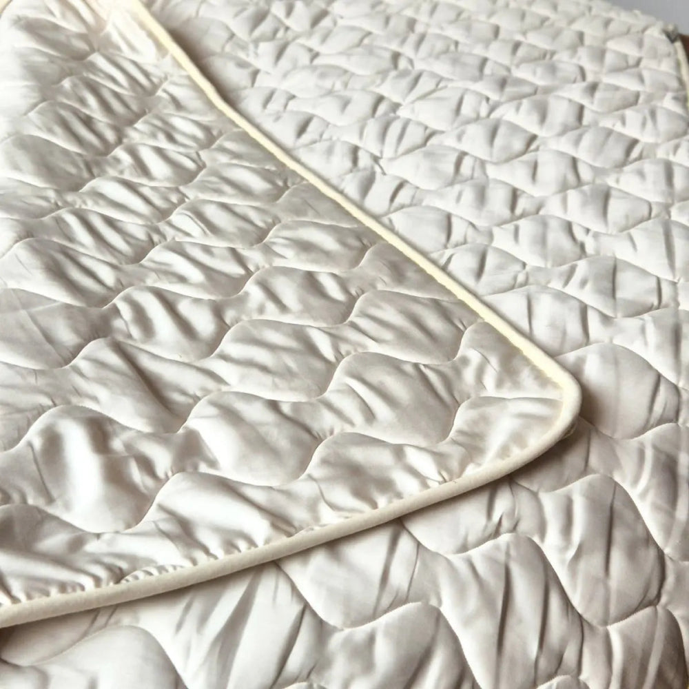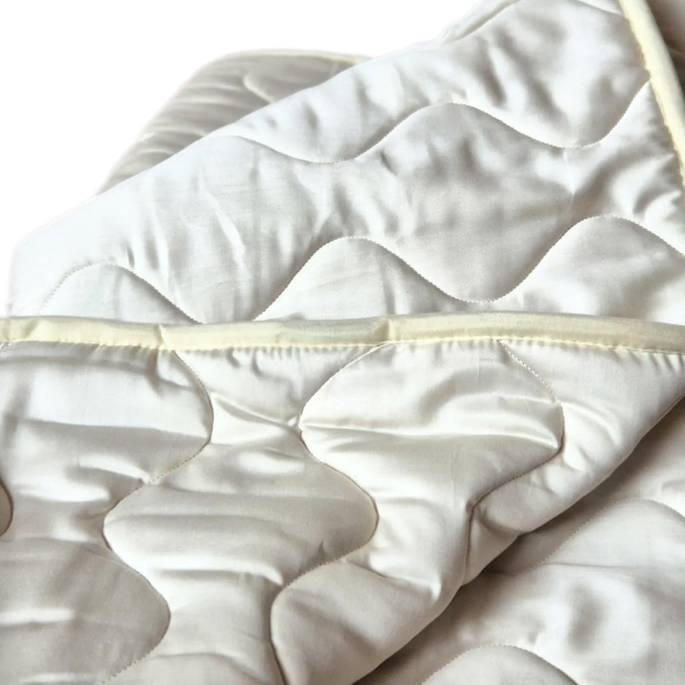 Die Außenfläche besteht aus einemBezug aus Satingewebe mit einer Grammatur von 130 g/m²Dadurch entsteht ein weicher, luxuriöser Look. Das dichte Satin-Gewebe hält die Wolle ordentlich an ihrem Platz und erhöht den Schlafkomfort.