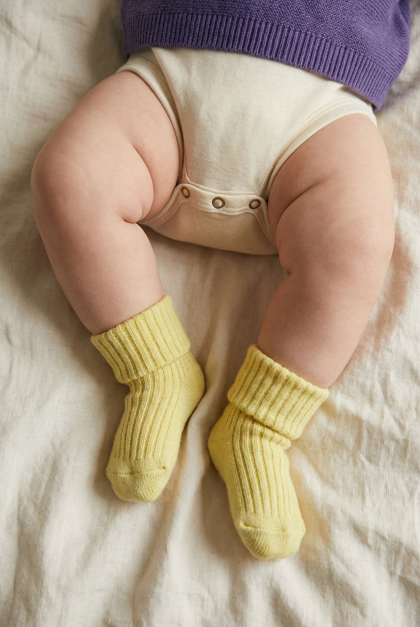 Socken, die Ihr Kleines schön warm halten. Hergestellt aus mulesingfreier Wolle. In der hellgelben Farbe Limonade. Material: 80 % Wolle,...