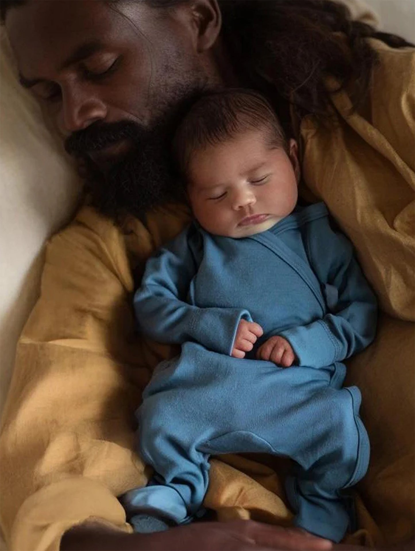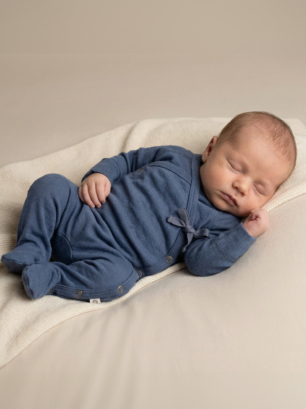 Playsuit with feet, so they stay nice and warm. Wrap closure, so that no draft comes through at the front....