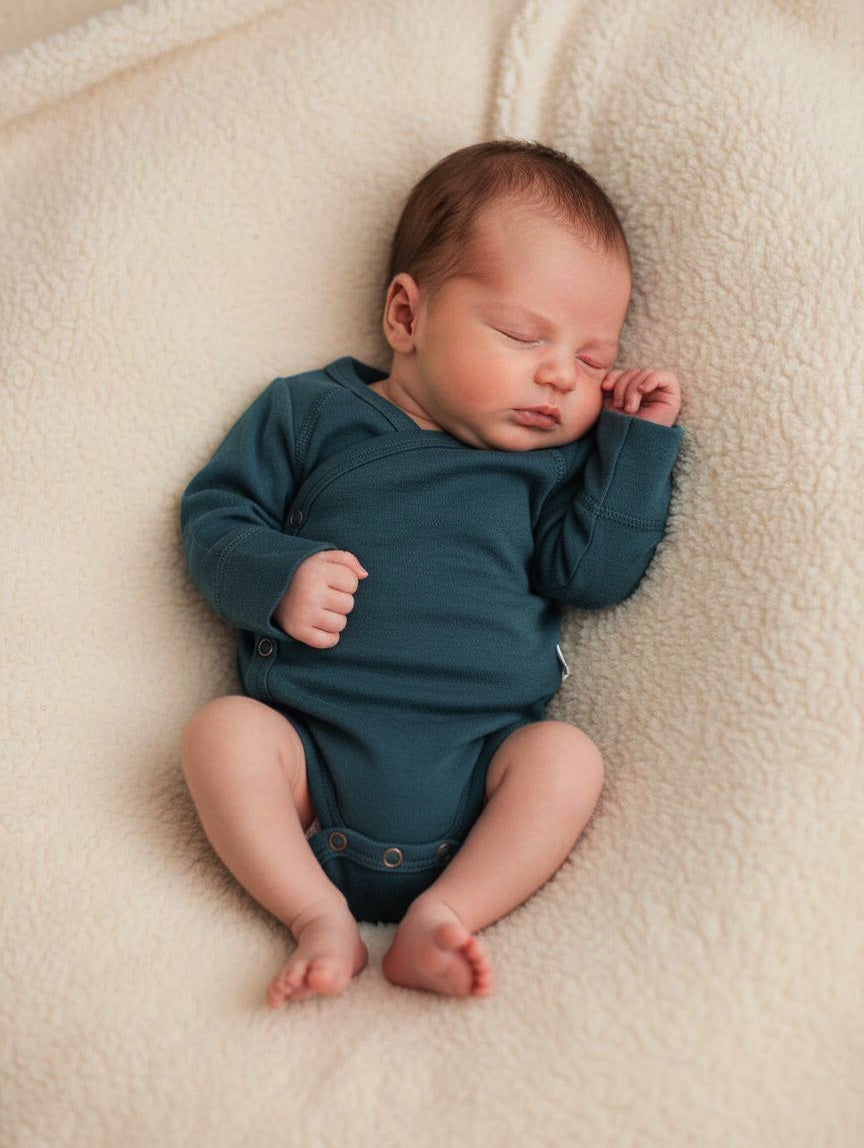 High quality merino wool, wonderfully soft. The wrap-over romper does not need to be worn over the baby's head. Extra...