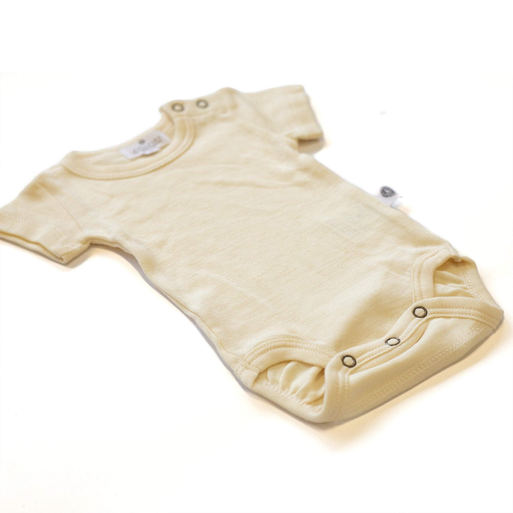 Hoge kwaliteit merinowol, heerlijk zacht. Basis baby rompertje met korte mouwen Drukknoopjes in de nek om makkelijker aan en uit...